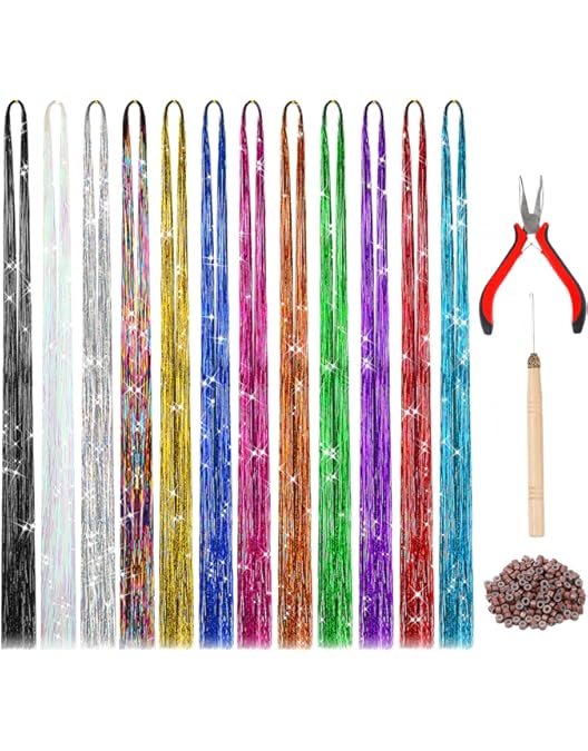 Amazon Com Zealibrate 12 Color Hair Tinsel Kit With 2400 Fairy Strands Tools Heat Resistant Sparkling Shiny Glitter Metallic Rainbow Holographic Hair String Extensions Christmas New Year Hair Accessories